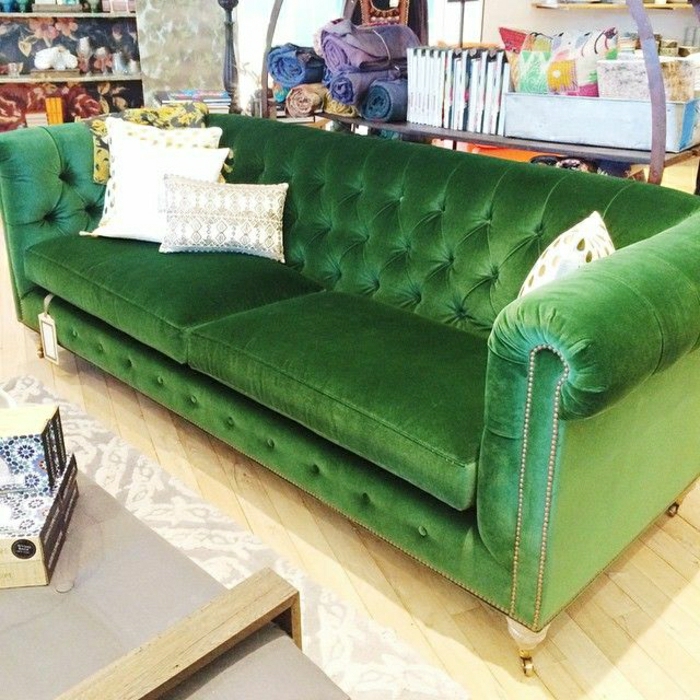 Schönes grünes Chesterfield Sofa Samt weiße Kissen resized resized