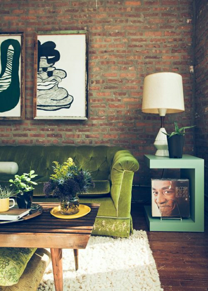 Wohnzimmer in grünen Nuancen Chesterfield Samt Ziegelwände resized resized