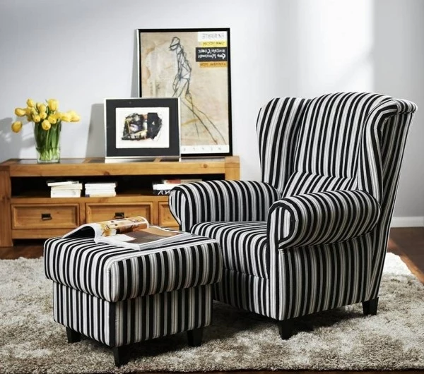 ohrensessel-mit-hocker-weiße-und-schwarze-linien- extravagante bilder dahinter