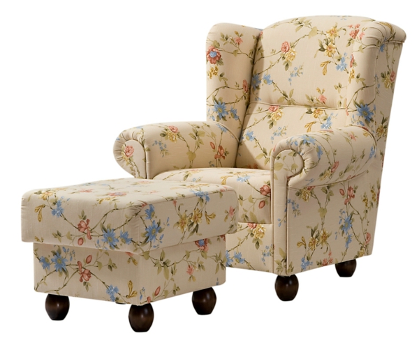 Sehr schöner ohrensessel mit hocker weißer hintergrund