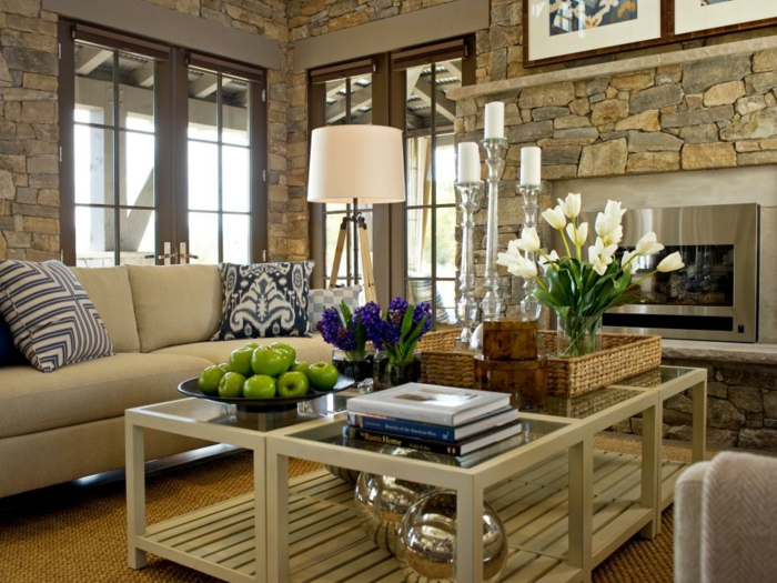 1 wohnzimmer deko ideen couchtisch holz glas tischdeko weiße tulpen lila hyazinthe stehlampe creme couch natursteinwand