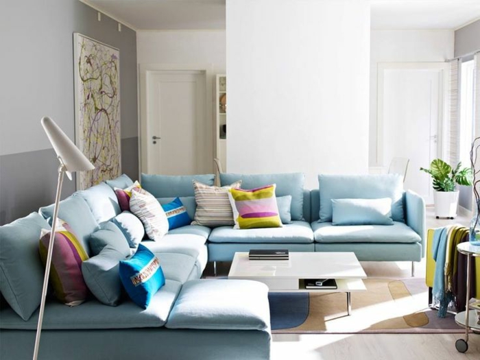 Deko ideen couch blau eckcouch bunte kissen stehlampe musterteppich graue wand abstraktes bild