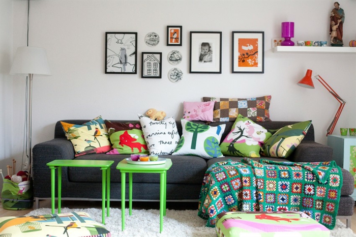 Deko ideen couch graue eckcouch musterkissen mustedecke grüne couchtisch stehlampe wandregal