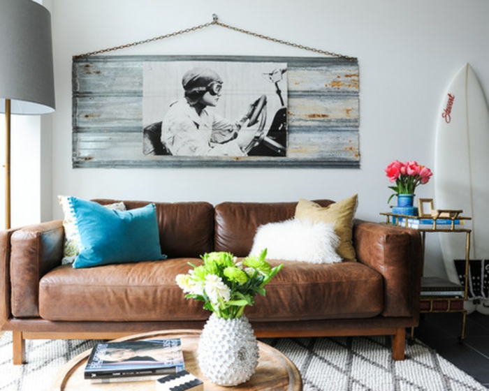Deko ideen ledercouch braun blaue kisse weiße plüschkisse runder holztisch blumendeko stehlampe plakatt