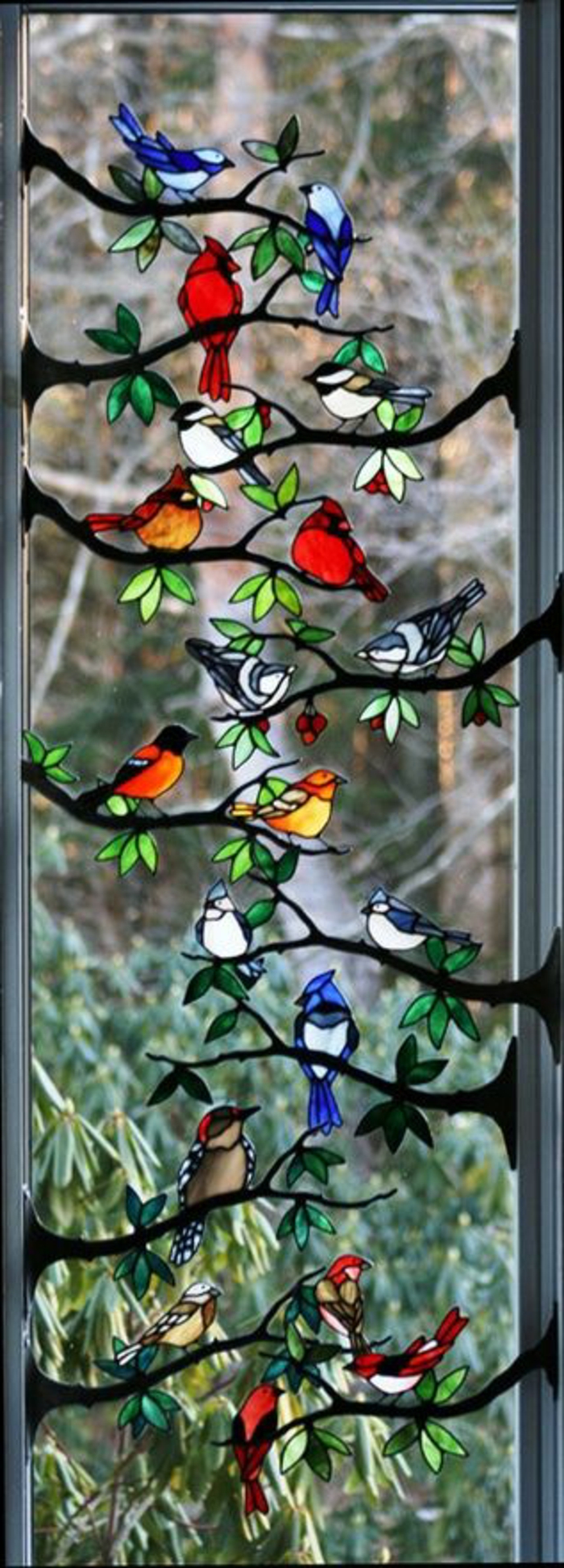 Wohnzimmer deko glasmalerei fensterdeko vögel naturmotive