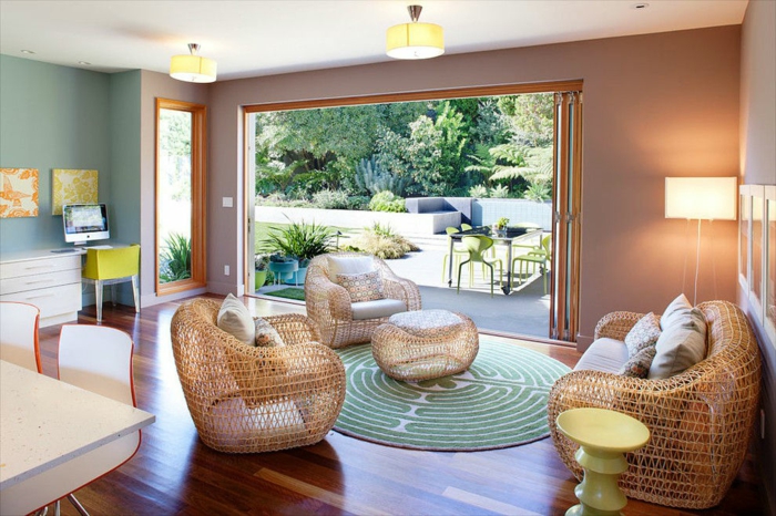 Wohnzimmer gestalten flechtmöbel runder musterteppich garten