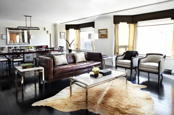Braune leder Sofas und schöne Teppiche im großen Wohnzimmer