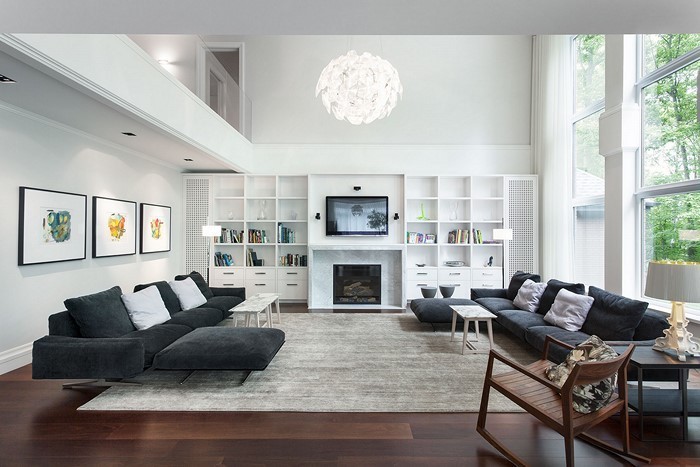 Wohnzimmer gestalten das moderne Wohnzimmer mit einer weissen Lampe und schwarzen Couchen