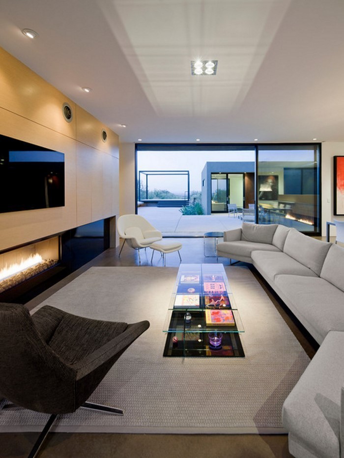 Wohnzimmer gestalten ein weisser Interior und ein grosser Fernseher