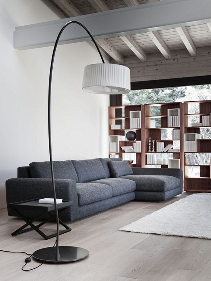 Wohnzimmer gestalten mit einer schwarzen Sofa und einer weissen Lampe