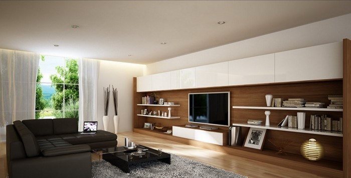 Wohnzimmer gestalten mit weissen Regalen und Vorhaengen