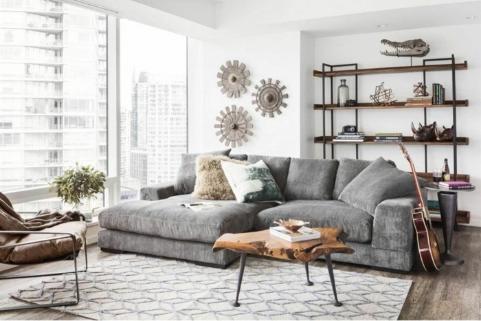 Ecksofa in grau wohnzimmer.einrichten modern kissen wandekoration kleiner kaffeetisch große fenster