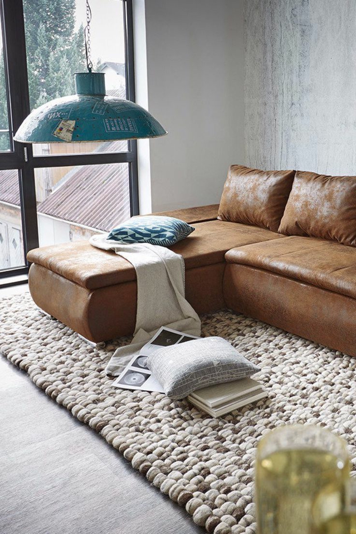 Hängende lampe in blau wohnzimmer gestalten teppich wohnzimmer sofa industrial chic sofa aus leder in braun