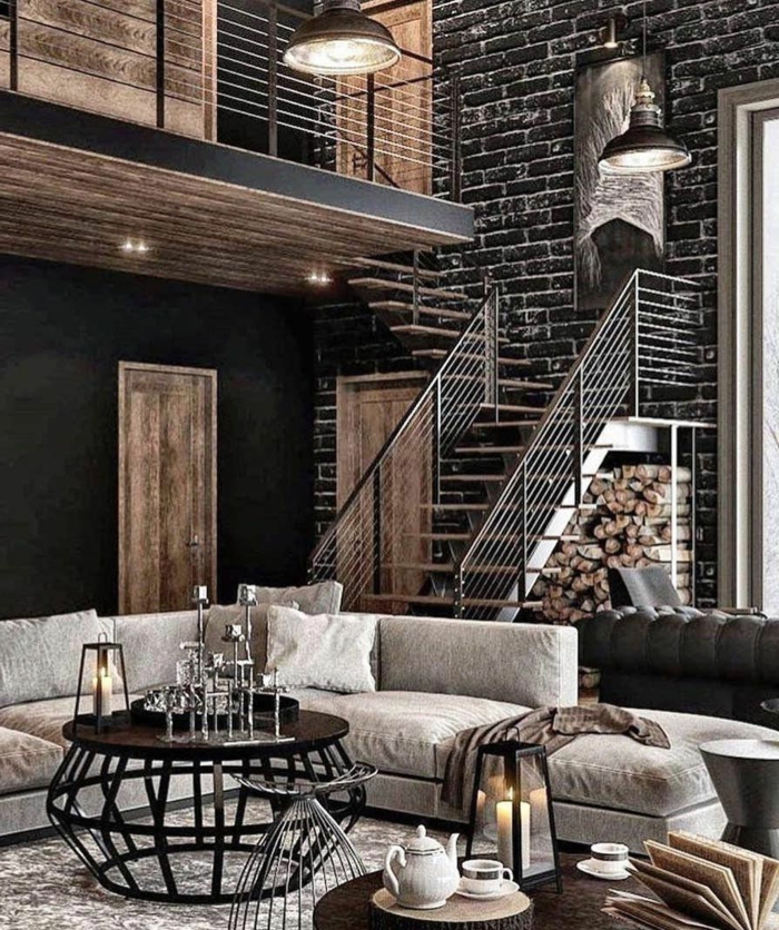 Industrial chic modernes wohnzimmer einrichten ideen großes eckosfa urban style ziegelwand in schwarz