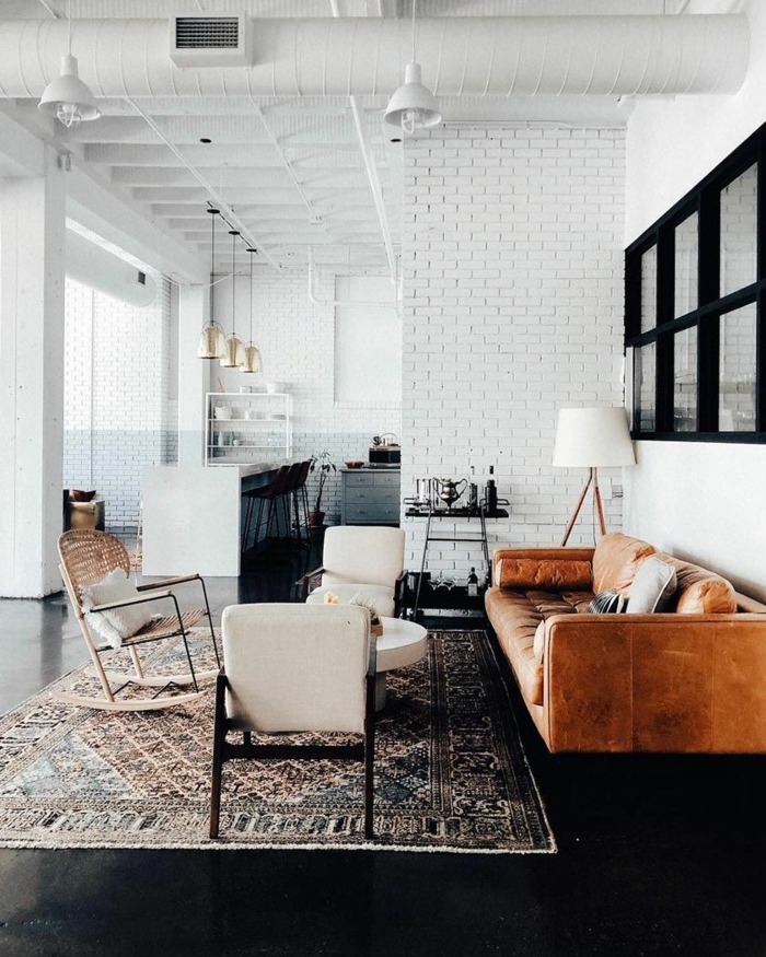 Industrialer style modernes sofa mit verschiedenartige andere möbel bunter teppich wohnzimmer ideen modern ziegelwand
