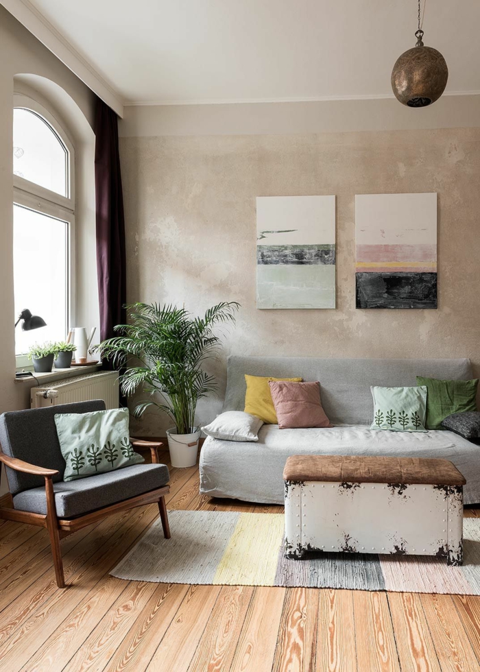 Kleines wohnzimmer einrichten farbig couch in pastellgrün pastellfarbene wand parkett kiste tisch