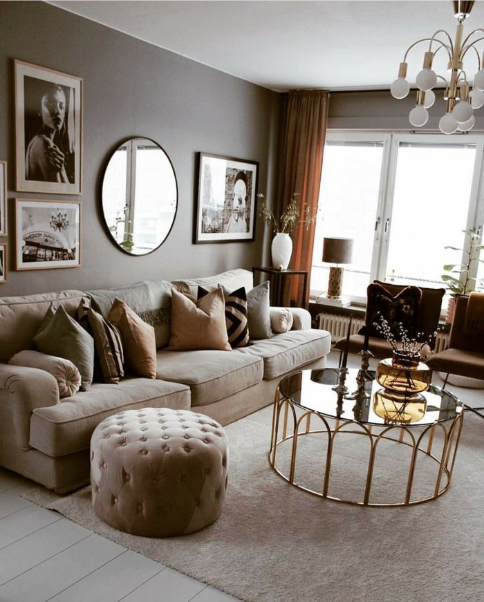 Kreative inspiration wohnzimmer einrichten ideen sofa in grau mit viele Kissen runder spiegel und photos an der wand