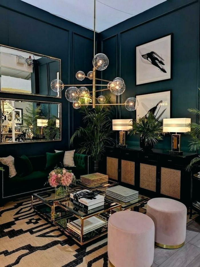 Kronleuchter für kleines Wohnzimmer Kaffeetisch dunkle Wand mit artistische Bilder Kaffeetisch Spiegel